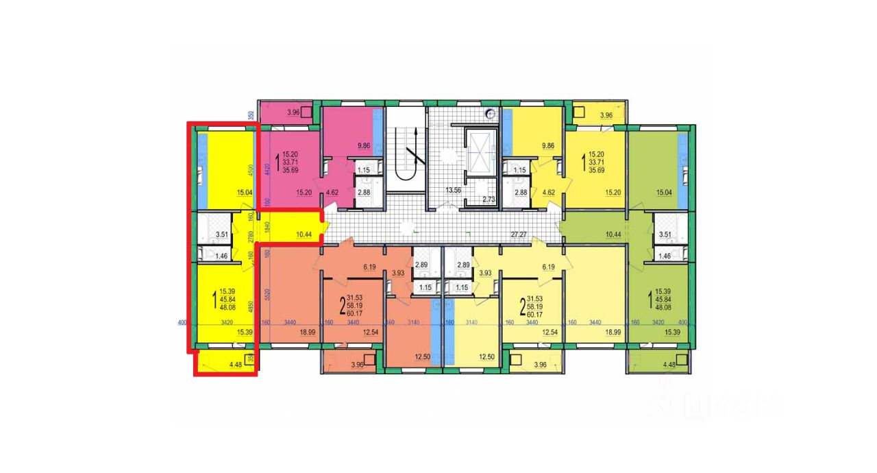 Площадь квартиры 45,8 кв.м. (с балконом 48,08 кв.м). Жилая комната площадью 15,4 кв.м., кухня площадью 15,1 кв.м., просторная прихожая, застекленная балкон 4,48 кв.м, санузел раздельный.