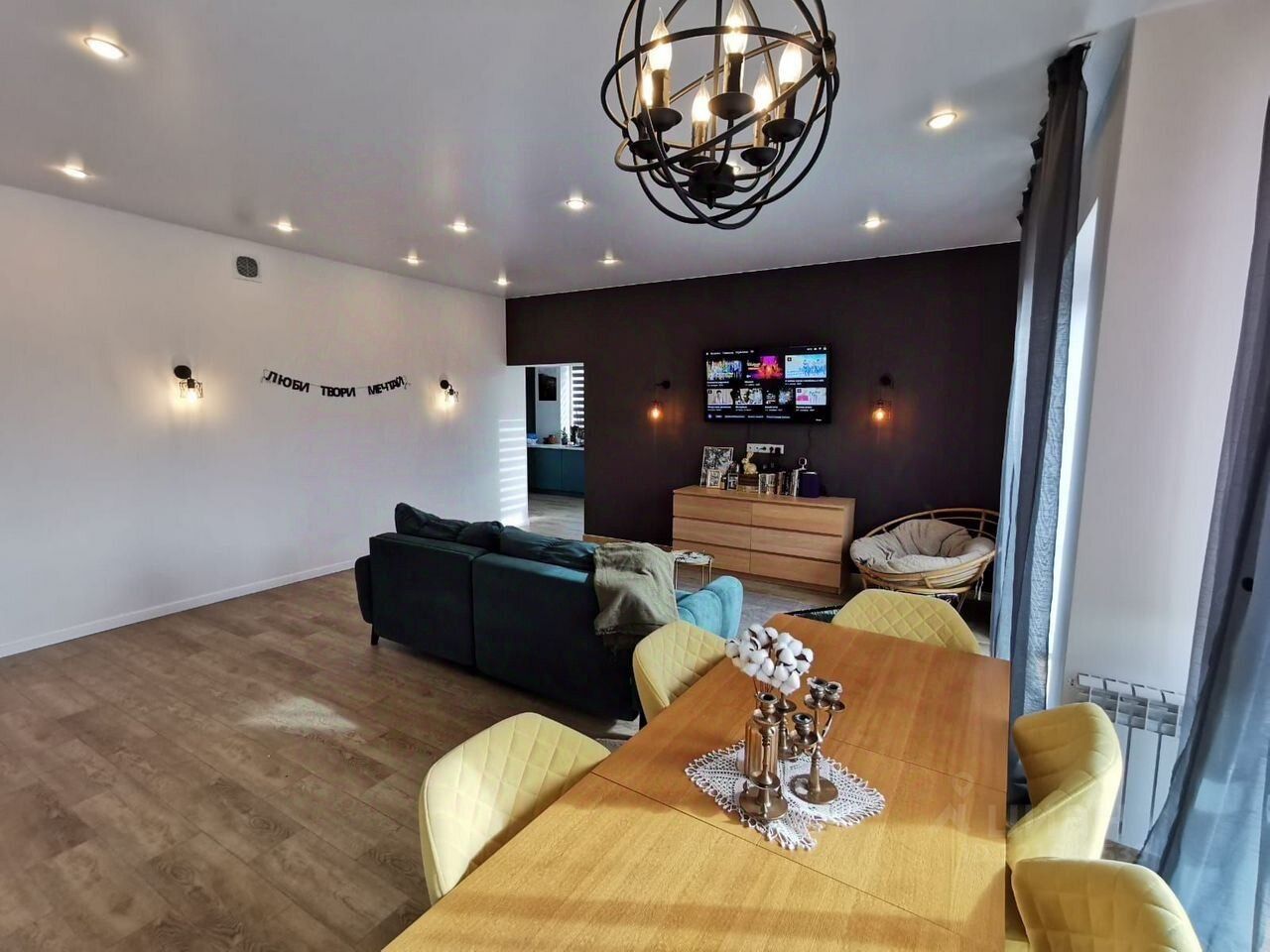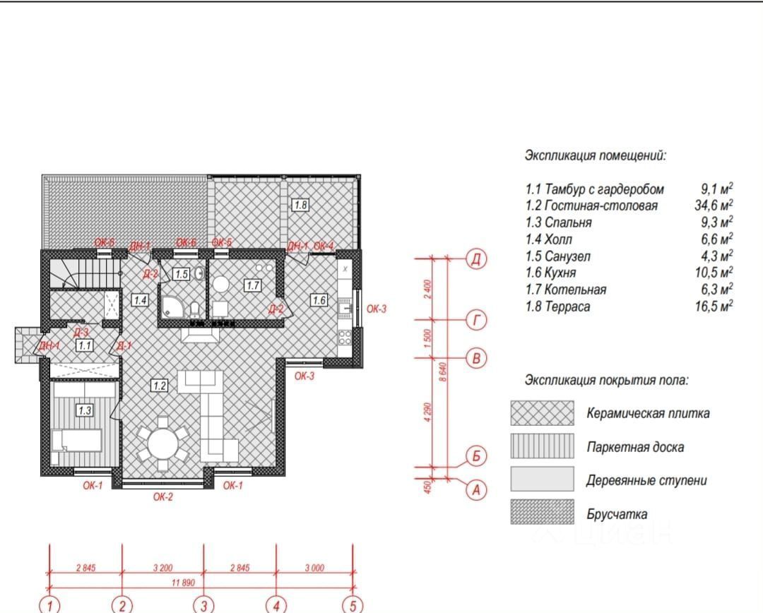 1 этаж: тaмбуp, спальня, санузел,гоcтинaя-cтоловая,кухня с выходом на террасу, с/у, кладовая.