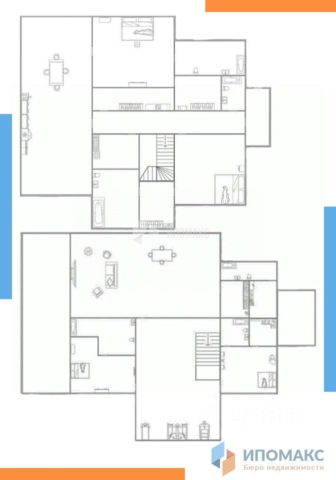 1 этаж: прихожая, котельная, просторная кухня-столовая переходит в светлую гостиную, две мастер-спальни с собственными гардеробными и санузлами, постирочная, кладовая, терраса. 2 этаж: 3 мастер-спальни, просторный холл.