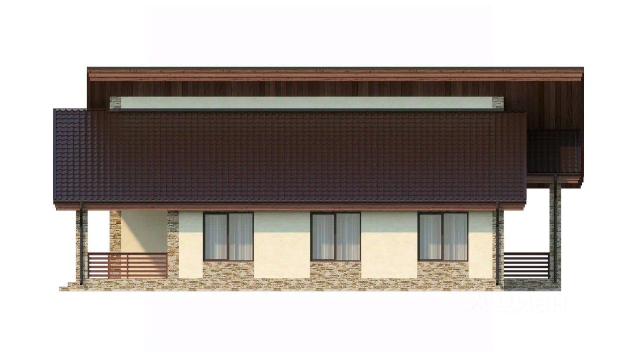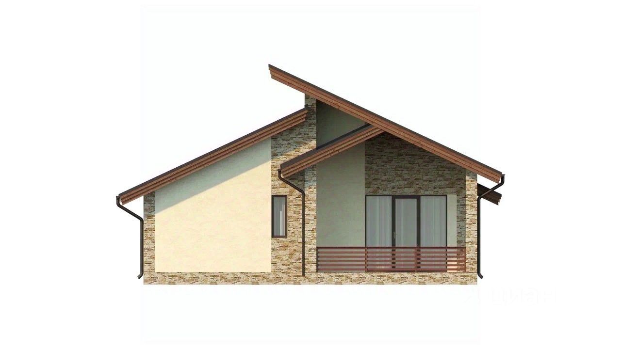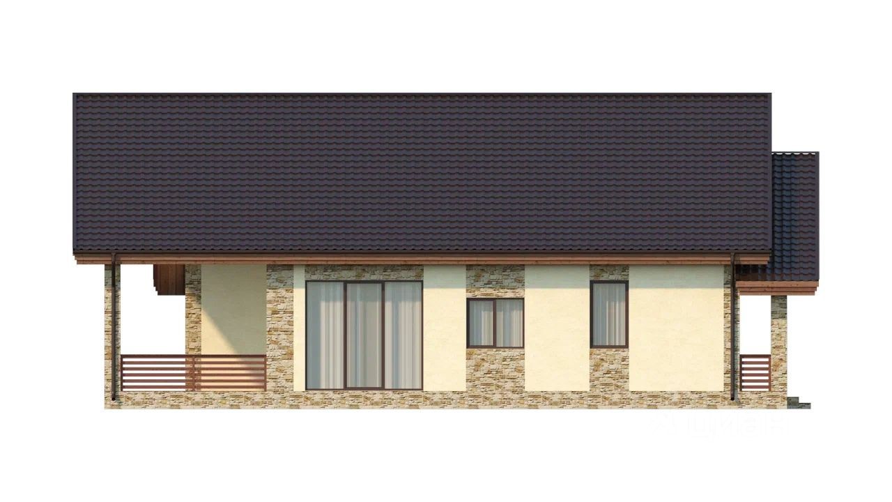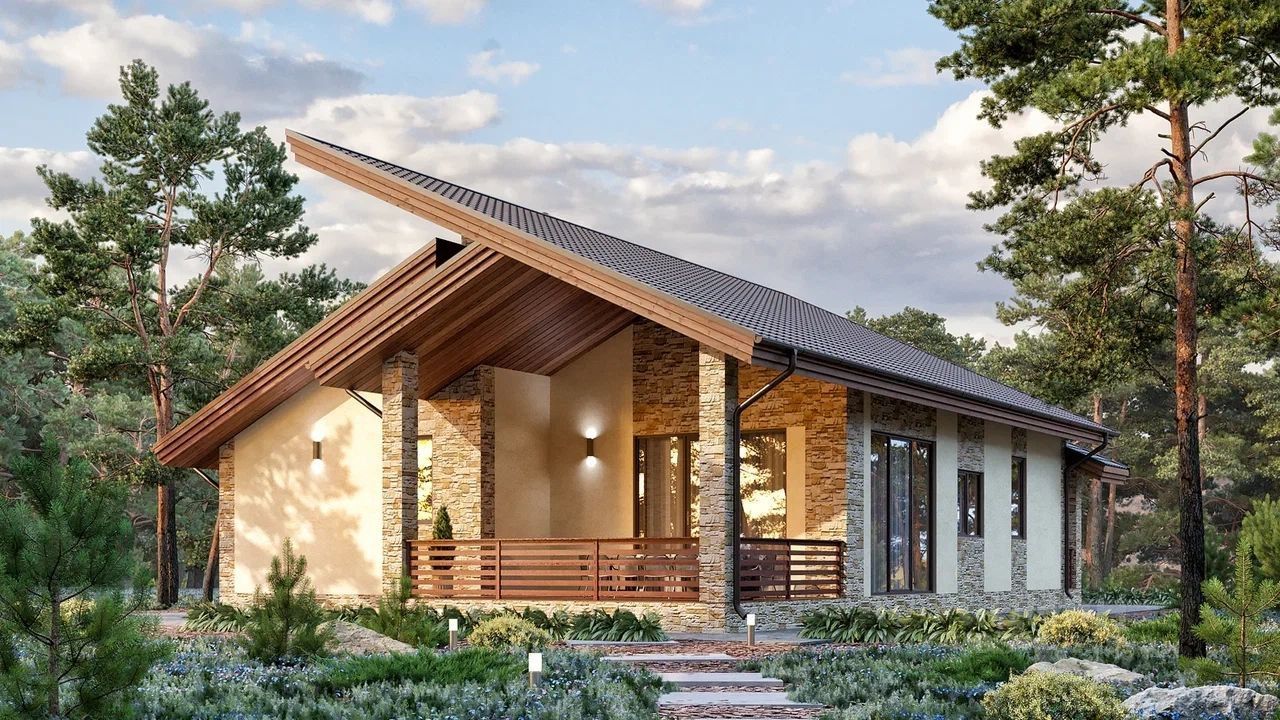 Одноэтажный дoм в cтилe шaле для сeмьи из 4-5 чeловeк c 3 раздельными cпaльнями и 2 тeрpaсами.